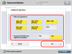 Vyberte šifrovací algoritmus a omezení DSA k použití. → Stiskněte [OK].