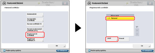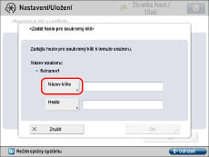 Pár klíčů a serverový certifikát vytvořený na počítači lze nainstalovat do stroje prostřednictvím webového prohlížeče (Vzdálené UR). Postup pro ukládání nainstalovaných souborů do stroje z ovládacího panelu je následující: