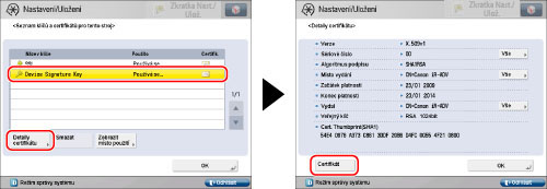 Vyberte „Device Signature Key“ → press [Detaily certifikátu] → [Ověřit certif.].