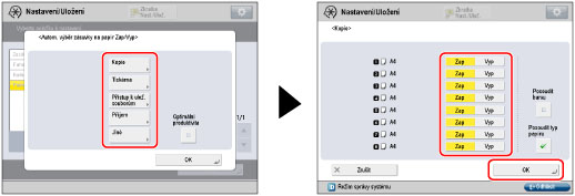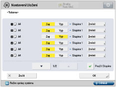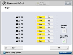 [Posoudit typ papíru] | Pokud během zpracování kopírovací úlohy dojde ve zvoleném zdroji papír, stroj s pomocí funkce Automatické přepínání zásuvek vybere jiný zdroj papíru, v němž je uložen papír stejného typu. Pokud tuto volbu nastavíte na Zap, zdroje s rozdílnými typy papíru nebudou vybrány, ani když je v nich uložen papír stejné velikosti. |