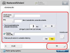 Nastavíte-li stroj tak, aby e-mailem odesílal odkaz na schránku, v níž je uložen soubor, můžete soubor ve schránce kontrolovat nebo s ním provádět různé operace pomocí vzdáleného UR (vzdáleného uživatelského rozhraní). Chcete-li odeslat e-mailem odkaz na schránku, stiskněte [Nastav. odes.URL] → zadejte místo určení → stiskněte [OK].