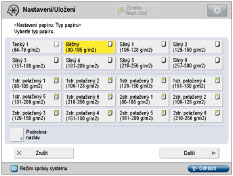 Pokud se typy papíru pro papír uložený ve stroji nezobrazí v seznamu podrobných nastavení, můžete tyto typy papíru uložit do systému stroje. Podrobné pokyny k ukládání typů papíru viz v „Základní informace o této funkci.“ Když ukládáte vlastní typ papíru pro zdroj papíru, je nastavení typu papíru chráněno a nemůžete změnit detailní informace pro vlastní typ papíru nebo smazat vlastní typ papíru v [Nastavení správy typu papíru] v [Možnosti] (Nastavení/Uložení). |
