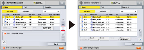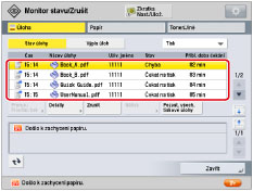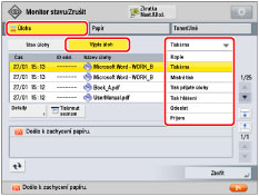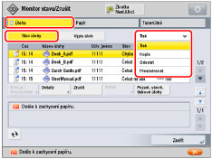 Ikony v levé části obrazovky označují stav úloh. Informace o typech ikon a podrobnosti o ikonách viz v „Ikony na obrazovce Úloha.“ Vyberete-li volbu [Tisk] v typech úloh, pro každou úlohu určenou ke zpracování se zobrazí přibližný čas čekání. |