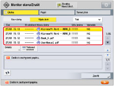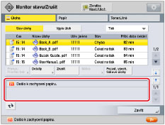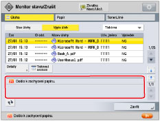 Zrušená úloha se zobrazí na obrazovce výpisu jako <NG> (No Good). Pokud není k dispozici papír stanovený při zadání úlohy, zobrazí se hlášení vyzývající k uložení příslušného papíru. Uložte papír a obnovte zpracování úlohy. Je-li volba [Časová prodleva zastavené úlohy] v [Nastavení funkcí] (Nastavení/Uložení) nastavena na Zap, úloha, která byla pozastavena, protože v době příjmu úlohy nebyl k dispozici papír pro tisk, se zobrazí jako pozastavená úloha po uplynutí zadané doby prodlevy. Chcete-li obnovit tisk pozastavené úlohy, uložte papír → vyberte úlohu → stiskněte [Detaily] → [Obnovit]. |