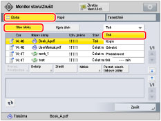 Pro pozastavení/obnovení tiskového procesu kopírovací úlohy vyberte [Tisk]. Vyberete-li [Kopie], tlačítka potřebná pro tuto operaci se nezobrazí. |