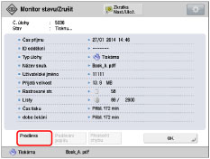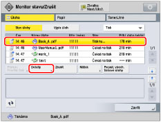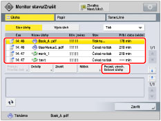 Vyberete-li tiskovou úlohu a stisknete [Detaily], stiskněte [Podávání papíru], chcete-li nuceně vytisknout tisková data zbývající v paměti, a stiskněte [Přeskočit chybu], chcete-li dočasně deaktivovat chyby a pokračovat v tisku. [Podávání papíru] a [Přeskočit chybu] lze používat pouze pro tiskové úlohy odeslané z počítače. Pokud není k dispozici papír stanovený při zadání úlohy, zobrazí se hlášení vyzývající k uložení příslušného papíru. Uložte papír a obnovte zpracování úlohy. Je-li volba [Časová prodleva zastavené úlohy] v [Nastavení funkcí] (Nastavení/Uložení) nastavena na Zap, úloha, která byla pozastavena, protože v době příjmu úlohy nebyl k dispozici papír pro tisk, se zobrazí jako pozastavená úloha po uplynutí zadané doby prodlevy. Chcete-li obnovit tisk pozastavené úlohy, uložte papír → vyberte úlohu → stiskněte [Detaily] → [Obnovit]. |