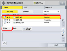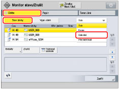[Odeslat znovu]: | Stroj opětovně odešle úlohu. Vyberete-li úlohu s více místy určení, stiskněte [Seznam vysílání] → vyberte místo určení pro opětovné odeslání úlohy → stiskněte [Odeslat znovu]. |