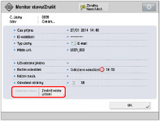 [Změnit místo určení]: | Stroj změní místo určení. Vyberete-li úlohu s více místy určení, stiskněte [Seznam vysílání] → vyberte místo určení, které chcete změnit → stiskněte [Změnit místo určení]. |