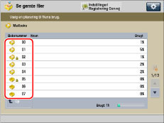 De valgte filer nummereres og printes i den nummererede rækkefølge. Du kan annullere indstillingen ved at vælge filen igen. Du kan annullere alle filvalg ved at trykke på [Slet det valgte]. ([Slet det valgte] ændres til [Vælg alle (maks. 100 filer)].) Hvis der er gemt to eller flere filer i mailboksen, kan du trykke på [Navn] eller [Dato/Tid] for at sortere listen med filerne. Hvis du lukker mailboksen efter at have sorteret filerne, er filerne ikke sorteret, næste gang du åbner mailboksen. Hvis een fil er gemt i mailboksen fra en computer, eller hvis du sletter en fil fra mailboksen efter at have sorteret filerne, forbliver den opdaterede liste sorteret. Hvis du trykker på [Navn] eller [Dato/Tid] med en fil markeret, fjernes markeringen af filen, og toppen af fillisten vises. |