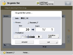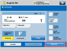 Du kan vælge og printe op til 32 filer i én mailboks ad gangen. Ved fletning af filer kan du vælge og printe op til 100 filer. Hvis der derimod er reserveret jobs i mailboksen, afhænger antallet af filer du kan vælge og printe af antallet af reserverede filer. Du kan kun vælge flere filer, når filerne er gemt i samme mailboks. Før du kan printe flere filer, der er lagrede i forskellige mailbokse, skal du først flytte filerne til en af mailboksene. (Se "Flytning/kopiering af en fil".) Ønsker du at printe en fil, som er gemt i maskinen fra en computer eller med [Gem i Mailboks] fra Kopifunktionen med de indstillinger, der blev valgt, da filen blev gemt, skal du ikke printe filen fra skærmbilledet Skift printindstillinger. Printer du filen fra skærmbilledet Skift printindstillinger, bliver filen måske ikke printet med de samme indstillinger, som blev angivet, da filen blev gemt. Hvis printindstillingerne for en fil, som er sendt til en mailboks fra en computer, ikke understøttes af denne maskine, kan du ikke printe filen. Hvis dette er tilfældet, skal du slette filen fra mailboksen, vælge andre indstillinger som understøttes af denne maskine på computeren, og derefter sende filen til en mailboks igen. Hvis du vil annullere alle indstillinger, skal du trykke på [Gendan stand.indst.]. For informationer om ilægning af papir kan du se "Ilægning af papir" |
