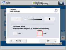 Justerer du baggrundstætheden med tryk på [Justér] for <Baggrundstæthed>, bliver indstillingen [Auto] annulleret. Hvis du tilsvarende trykker på [Auto], mens du laver manuelle justeringer i [Justér], bliver dine justeringer annulleret. Maskinen justerer automatisk tætheden, så den passer til baggrunden. |