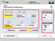 Hvis du ikke bruger statussen Hæftescanning, kan du ikke vælge layoutet for 2-sidede originaler. Hvis statussen Hæftescanning ikke anvendes, kan du ikke vælge [Auto] for originalen. Du kan ikke vælge [2-sidet original], hvis A6R er det valgte originalformat.
