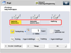 For informationer om ekstraudstyr, se: Hvis [Finishing] ikke er valgt, afleveres arkene på samme måde, som når [Staksortér (samme sider)] er valgt. Hvis [Automatisk sætsortering] er indstillet til 'Til', bliver Sætsortering eller Sætsortering med forskydning automatisk valgt, når du anbringer originalerne i fremføreren. (Se "Aktivering af automatisk sætsortering".) Du kan få vist detaljerede informationer om det valgte papir ved at trykke på [Detaljer]. |