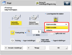 Du kan kun indstille [Angiv antal af kopistakke], hvis du vælger [Stablerområde] for <Leveringssted for stabler>. |