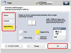 Statussen Ryghæftning kan kun indstilles, hvis du vælger 2-sidet kopiering. Hvis Saddle Finisher-AN er monteret, kan følgende papirformater rygfoldes: 330 mm x 483 mm, 305 mm x 457 mm, 320 mm x 450 mm (SRA3), A3, B4, A4R, 13" x 19", 12" x 18", 12 5/8" x 17 11/16", 11" x 17", LGL, LTRR eller brugerdefineret format (210 mm x 279,4 mm til 330,2 mm x 487,7 mm (8 1/4" x 11" til 13" x 19 1/4")) |
