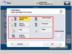 For at justere prioriteringsniveauet for behandling af tekst/foto skal du trykke på [Tekst/printet billede], [Tekst-/fotoprint], [Kort] eller [Original farvekopi].