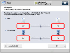 For at kunne kopiere tekst og linjer tydeligt, skal indstillingen være henimod [Høj] for tekstområdet. For at kopiere originaler med trykte fotos eller andre halvtonere, skal indstillingen være hen mod [Lav] for foto/billedområdet.
