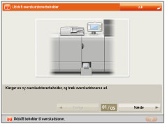 Færdiggør instruktionerne om, hvordan der er adgang til udskiftning af beholderen ved at trykke på [Forrige] eller [Næste] på touchpanelet. Hvis beholderen til brugt toner skal udskiftes under et printjob, udføres de resterende print, når den nye beholder til brugt toner er installeret. Overskudstonerbeholderen kan udskiftes, mens maskinen printer. |
