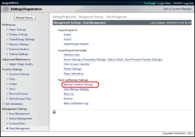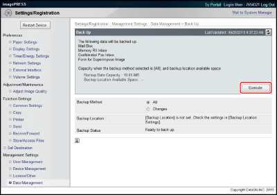 Hvis du vil planlægge en sikkerhedskopiering, skal du klikke på [Settings/Registration] → [Data Management] → [Auto Backup Settings]. Vælg enten [Back Up All] eller [Back Up Changes] og [Everyday] eller [Specify Days] → indtast tidspunktet for udførelse af sikkerhedskopieringen. |