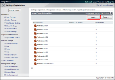 Du kan ikke importere en fil, mens maskinen scanner. Ved import: Indstil på forhånd [Auto Shutdown Time] til '0'. Der kan opstå en fejlfunktion, hvis maskinen automatisk lukker ned under import. Flere informationer om statussen Auto nedlukning kan du se "Automatisk nedlukningstid" |