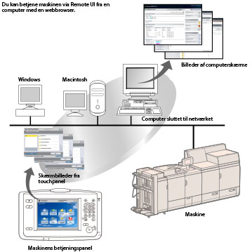 Med Remote UI (User Interface), der er præinstalleret software, kan du få adgang til maskinens funktioner via din computers webbrowser. F.eks. kan du med Remote UI få adgang til maskinen for at kontrollere jobstatus, udføre job og angive forskellige indstillinger. Den eneste, du skal bruge, for at anvende Remote UI, er en webbrowser og en netværksforbindelse mellem din computer og maskinen.