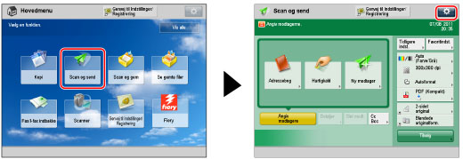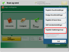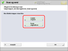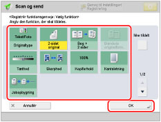 Der vises to funktionsgenveje i skærmbilledet Scan og send. [2-sidet original] og [Blandede originalform.] vises som standard. Disse genveje kan ændres til funktioner, som du ofte anvender.