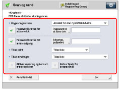 Password kræves f. at ændre adgang. | Brug denne funktion til at angive et password for print eller redigering af den scannede PDF. Vælg denne tast, hvis du vil angive indstillinger som <Tillad print>, <Tillad ændringer> og [Aktivér tilgæng., kopi. og konvert. af billeder/tekst]. |