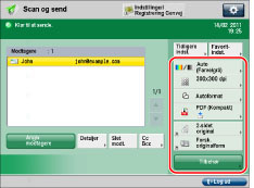 Efter et job er sendt, kan sendeindstillinger bevares, dog ikke for de angivede modtagere. Hvis du vil annullere indstillingerne, skal du trykke på .Vil du sende andre jobs med samme indstillinger, skal du angive modtagerne for disse jobs, da de angivede modtagere for det tidligere job ikke er bevaret. |