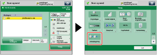Du kan kun ændre de indstillinger, der er vises i [Skift indst.], når du er i statussen Jobopbygning. Du skal på forhånd angive de nødvendige scanningsindstillinger. Hvis du anbringer originalerne i fremføreren, skal du fjerne hver original fra originaloutputområdet efter endt scanning af hver gruppe. Det maksimale antal sider, der kan sendes på en gang er 999. Når du bruger [Jobopbygning], vises en meddelelse, der spørger dig, om du vil sende jobbet, når 999 sider af originalen er blevet scannet. Hvis du vælger at sende jobbet, bliver de scannede 999 sider sendt. Hvis du annullerer dette job, bliver de scannede sider ikke sendt. |