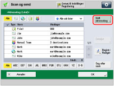 [Skift adressebog] vises kun, når både fjernadressebogen og LDAP-serveren er registreret. Hvis kun fjernadressebogen er registreret på denne maskine, vises [Til fjern- adressebog]. |