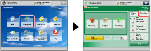 For at benytte denne funktion skal du første registrere de ønskede dokumentindstillinger og de ønskede modtagere i en favorittast. For instruktioner om registrering af modtagere og indstillinger af en favorittast kan du se "Registrér/redigér favoritindstillinger" |