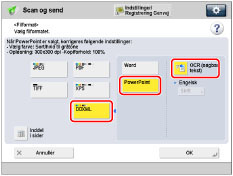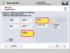 Hvis du vælger PDF (OCR), XPS (OCR) eller OOXML (OCR) som filformat, og <Smart Scan> er slået 'Til' i [Indstillinger for OCR (Søgbar tekst)] (Indstillinger/Registrering), bestemmes originalens retning, og dokumentet roteres automatisk før afsendelse, hvis det er nødvendigt. (Se "Indstillinger for oprettelse af søgbar PDF/XPS/OOXML".) Vælger du [OCR (Søgbar tekst)], kan du kun sende med et zoomforhold på [1:1 (100 %)] eller [Auto]. Vælger du PDF eller XPS som filformatet, kan du angive [Kompakt] og [OCR (Søgbar tekst)] samtidigt. I dette tilfælde vises [PDF (Kompakt)] eller [XPS (Kompakt)] som filformat på skærmbilledet Grundlæggende Scan og send-funktioner. Vælger du [Word] for [OOXML], kan du vælge at slette de scannede baggrundsbilleder. Du kan generere Word-filer, som er lette at redigere uden uønskede billeder. (Se "Sletning af baggrundsbilleder ved generering af Word-filer".) |