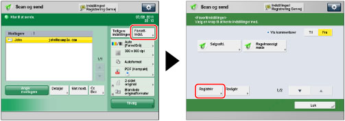 → [Scan og send] → angiv modtageren og sendeindstillinger til registrering.