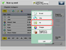 Det første tegn, du indtaster af navnet, anvendes til sortering af modtagerlisten, når du trykker på taster som f.eks. [ABC], [DEF] og [GHI] på skærmbilledet Adressebog. Hvis du trykker på [Søg efter navn] på skærmbilledet Adressebog, vises et skærmbillede til indsnævring af søgningen i adressebogen. |