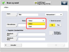 Hvis du ikke sender dokumenter via en server, og modtagerens IP-adresse ikke er registreret på en DNS-server, skal du indtaste domænenavnet i det følgende format: (bruger)@(modtagerens IP-adresse). |