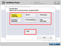 Gendanner du ikke data for [Værdi for Indst./Reg.] og [Adressebog] samtidigt, bliver indstillingerne i [URL-snd- indstill.] for [Vælg Fax/I-fax indbakke] og [Indstillinger for mailboks] måske slettet. |