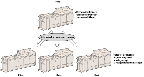Klargøring til levering og opdatering af information, efter det er modtaget, kan tage flere minutter. Du må ikke slå hovedafbryderen FRA, før disse aktiviteter er færdige. Ellers vil maskinen måske ikke fungere korrekt. Enhedsinformation kan deles mellem maskiner af samme model. Visse informationer vil ikke kunne overføres korrekt afhængig af det tilbehør, der er tilgængelige for brug på maskinen. Er [Begræns modt. af enhedsinfo.] for <Indst. for modtagelse> slået 'Fra', kan maskinen modtage enhedsinformationer, der leveres af forskellige maskinmodeller. (Se "Indstilling af modtagermaskinen".) Dog leveres visse informationer muligvis ikke korrekt. Enhedsinformation kan ikke leveres, hvis det systemadministrator-ID og den system-PIN-kode, der er registreret i klientmaskinen, er forskellige fra det systemadministrator-ID og den system-PIN-kode, der er registreret i hostmaskinen. |