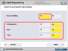 Tryk på [Indstillinger for nummerering af kopisæt] → [Til] for <Numm.indstilling> → angiv hver indstilling.