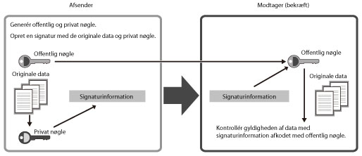 Den digitale signaturs struktur er angivet herunder. Ved at sammenligne de krypterede data fra afsenderen med den offentlige nøgle kan modtageren kontrollere afsenderens og dataenes ægthed.