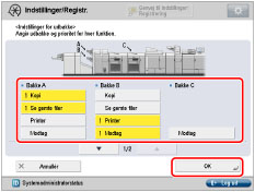 Du kan angive en udbakke til flere funktioner. Prioriteten af leveringsdestinationerne bestemmes af rækkefølgen for de valgte udbakker. Prioriteten vises som "1" og "2". Hvis Stor papirstak er indstillet til "Til", er outputrækkefølgen for bakke B indstillet til "1", så en prioritet til bakke B ikke kan ændres. Men hvis outputrækkefølgen for bakke C er indstillet til "1", når High Capacity Stacker-H er monteret, gives prioriteten til bakke C. (Se "Stor papirstak".) |