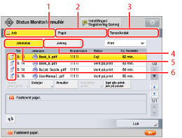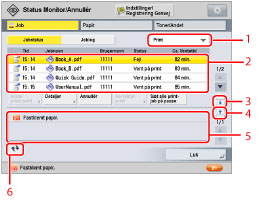 2 | Jobliste På skærmbilledet Jobstatus kan du se igangværende jobs og ventende jobs. Ved at trykke på knapper under joblisten kan du ændre rækkefølgen for ventende jobs, annullere jobs og tjekke jobdetaljerne. De viste knapper kan være anderledes. Det afhænger af den igangværende jobtype. For flere informationer om knapperne der vises på skærmbilledet Jobstatus, kan du se "Ikoner på skærmbilledet Joblog" |
