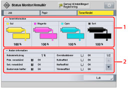 3 | Toner/Andet Tryk for at vise skærmbilledet Toner/Andet. Du kan tjekke den resterende tonermængde og resterende mængde og overskudsmængde for andre forbrugsstoffer end toneren. For flere informationer skal du se "Skærmbilledet Toner/Andet" |