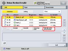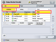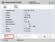 Hvis du vælger et printjob og trykker på [Detaljer], skal du trykke på [Papir- fremføring] for med tvang at printe de printdata, der resterer i hukommelsen og trykke på [Ignorér fejl] for midlertidigt at deaktivere fejl og fortsætte printning. [Papir- fremføring] og [Ignorér fejl] kan kun anvendes til printjobs, der er sendt fra computeren. Hvis det angivede papir på det tidspunkt, hvor jobbet blev angivet, ikke er tilgængeligt, vises en meddelelse, der beder dig ilægge passende papirer. Læg papiret i, og genoptag jobbet. Hvis [Timeout for jobbet afbrudt] er indstillet til 'Til' i [Funktionsindstillinger] (Indstillinger/Registrering), vises jobbet, der er afbrudt, fordi der ikke var papir til rådighed til printning ved jobbets modtagelse, som et afbrudt job, når en angiven tid er forløbet. For at genoptage print af et afbrudt job skal du ilægge papiret → vælg jobbet → tryk på [Detaljer] → [Genoptag]. |
