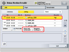 [Registrér modtagere]: | Registrerer det valgte job som modtageren. Vælg [Adressebog] eller [Hurtigkald] for at vise skærmbilledet Indstillinger/Registrering. (Se "Registrér modtagere" eller "Registrering af hurtigkaldstaster") Hvis [PIN til adressebog] er indstillet i [Angiv modtager] (Indstillinger/Registrering), vises et skærmbillede, hvor du skal indtaste passwordet. (Se "Indstilling af adressebogen".) |