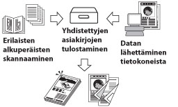 Skannaa ja tallenna -toiminto mahdollistaa skanneriyksiköllä skannatun tai tietokoneessa luodun asiakirjadatan tallentamisen. Tallennettu data voidaan tulostaa määritettynä aikana, tai se voidaan yhdistää erikseen tallennettuun dataan tai tietokoneessa luotuun dataan samanaikaisesti käsiteltäväksi.