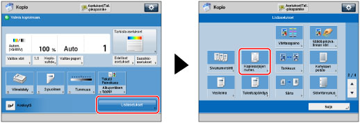 Jos asetat [Kopiosarj. num.] asetukseksi 'Kyllä', [Koko sivu] ja [Numer. 5:ssä paikassa] ovat himmeät eikä niitä voi valita. (Katso "Kopiosarjan numeroinnin lisäasetukset.") Jos asetat keksi seuraavista [Sivu- numerointi], [Vesileima] tai [Tulostus- päivämäärä] tulostumaan samaan kohtaan, näyttöön tulee vahvistusviesti kun painat . |