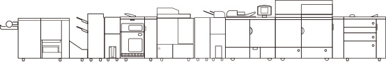 Two-Knife Booklet Trimmer-A, Booklet Trimmer-F, Saddle Finisher-AN, Paper Folding Unit-J, High Capacity Stacker-H, Perfect Binder-E, Multi Function Professional Puncher-B, Document Insertion Unit-N, Duplex Color Image Reader Unit-M, POD Deck-D ja Upright Control Panel-F asennettuna.