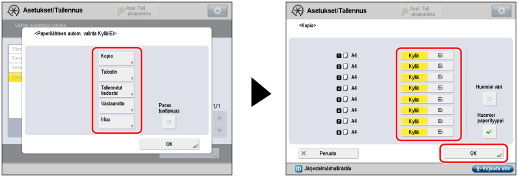 [Huomioi paperityyppi] | Jos valitusta paperilähteestä loppuu paperi kopioinnin aikana, valitaan Automaattisella kasetinvaihdolla toinen, samaa paperityyppiä sisältävä paperilähde. Jos teet asetuksen 'Kyllä', eri paperityyppejä sisältäviä paperilähteitä ei valita, vaikka ne sisältäisivät samaa paperikokoa. |