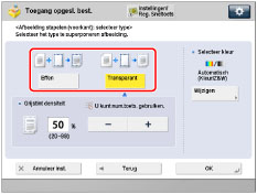 Om de modus Superponeer afbeelding te kunnen gebruiken, moet de afbeelding al eerder in het geheugen van de machine zijn geregistreerd. (Raadpleeg "Instellen van het opvangblad van de stapelaar".) |