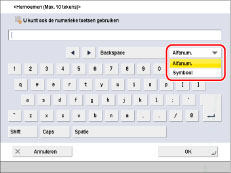 Als u tijdens het invoeren van tekens een vergissing maakt, drukt u op of om de cursor te verplaatsen → druk op [Backspace] om de tekens te verwijderen → voer de juiste tekens in.Om alle tekens te verwijderen die u heeft ingevoerd, drukt u op .De beschikbare invoermodi en het maximum aantal tekens dat u kunt invoeren verschillen, afhankelijk van het type invoer. Als u vaak tekst invoert die bestaat uit hoofdletters (bijv. AAAAA BBBBB CCCCC), selecteert u [Aan] voor [Shift Lock-functie van toetsenbord gebruiken] bij [Voorkeuren] (Instellingen/Registratie). (Raadpleeg "Wijzigen van instellingen van functie Shift Lock op toetsenbord".) Als u vaak tekst invoert die begint met een hoofdletter (bijv. Aaaaa Bbbbb Ccccc), selecteert u [Uit] voor [Shift Lock-functie van toetsenbord gebruiken] bij [Voorkeuren] (Instellingen/Registratie). (Raadpleeg "Wijzigen van instellingen van functie Shift Lock op toetsenbord".) |